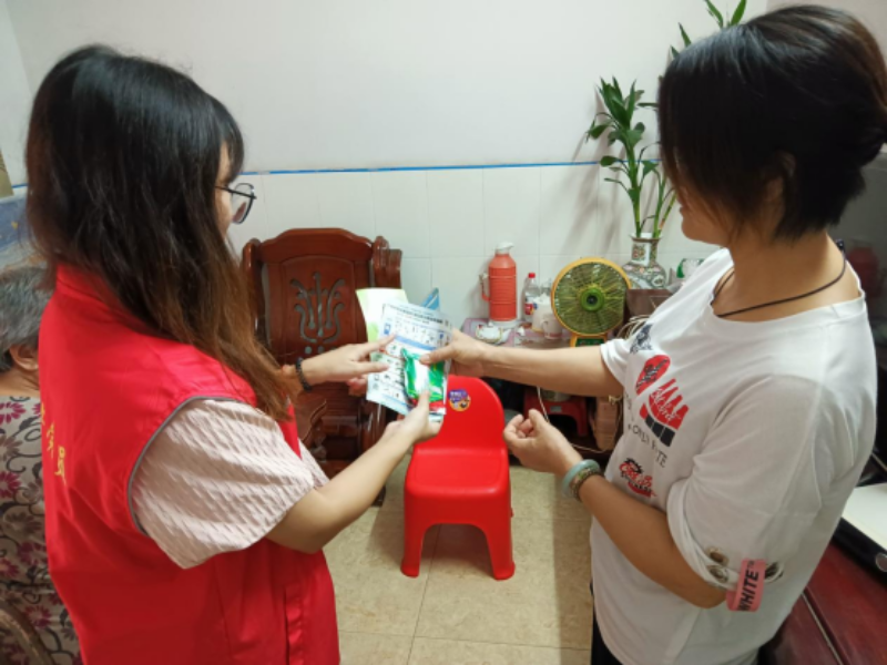 (图:公卫委成员上门派发宣传单张和灭蚊片)