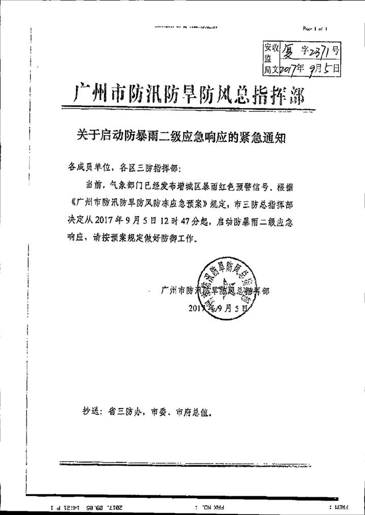 转发关于启动防暴雨二级应急响应的紧急通知,请各单位做好防御工作