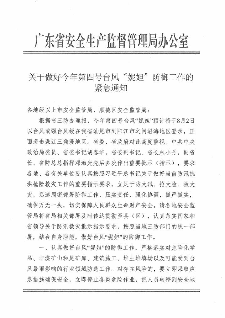 转发省安全监管局关于做好今年第四号台风“妮妲”防御工作的紧急通知