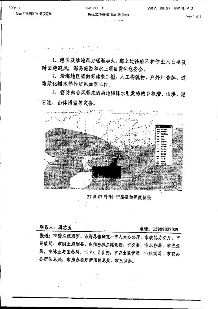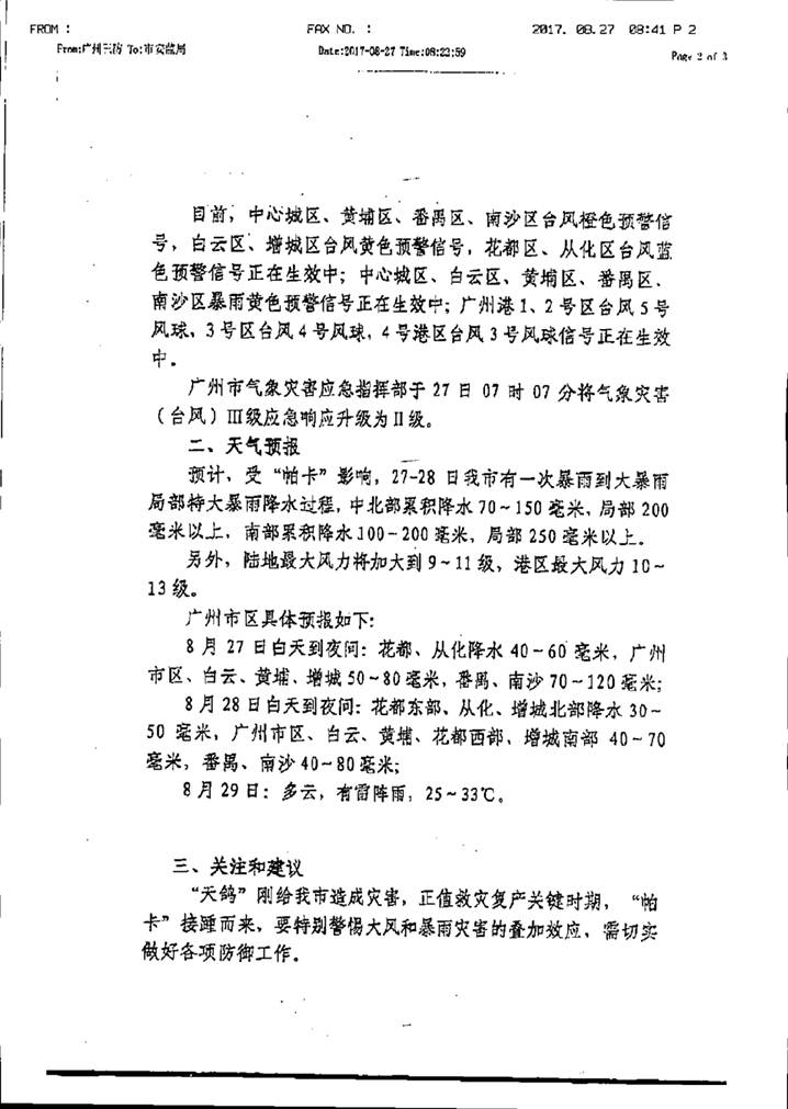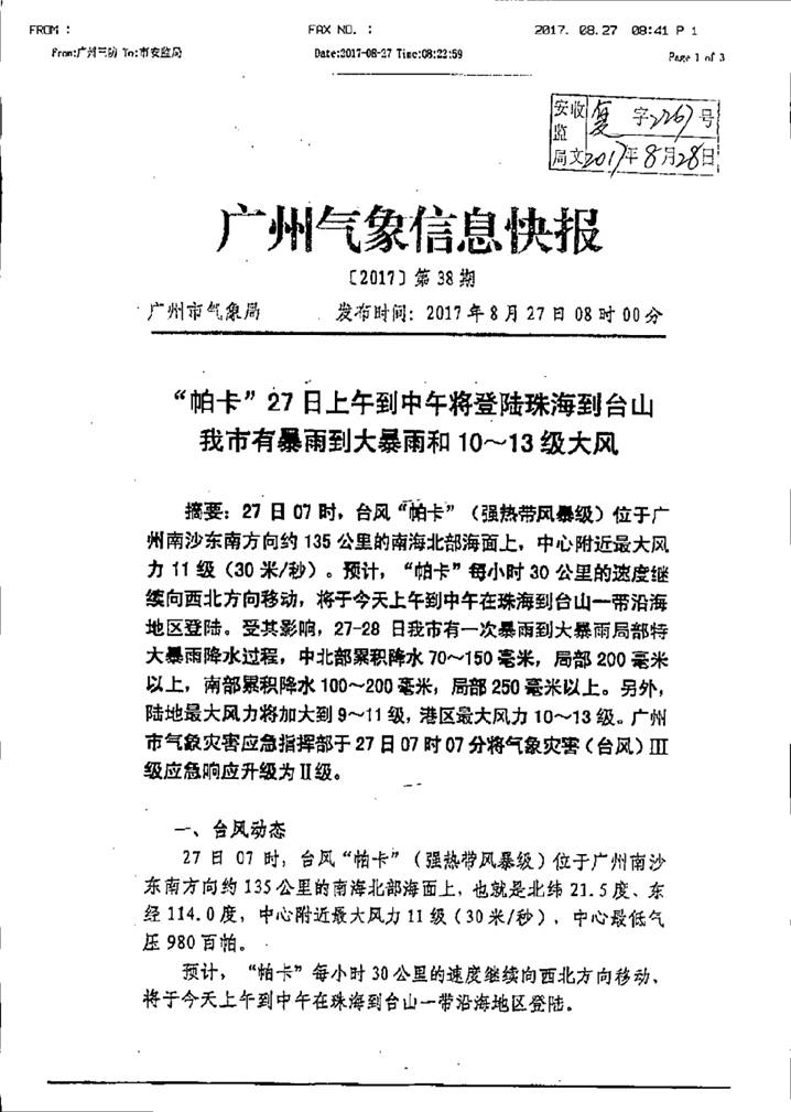 转发“帕卡”27日上午到中午将登陆珠海到台山,我市有暴雨到大暴雨和10-13级大风,请各单位做好防御工作