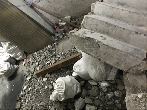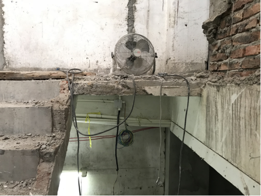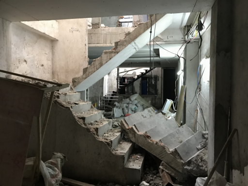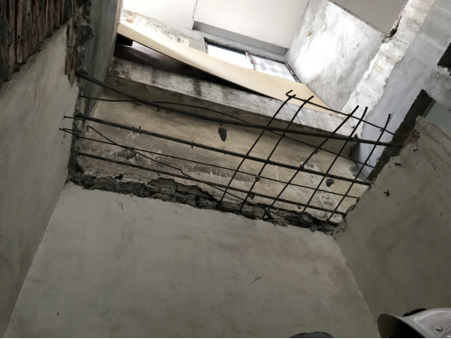 楼梯的拆除方法由时超群与陈焯威凭经验确定,两人经过商量后,用一条截面规格为10*10cm的长方钢管斜顶在梯段底部做支撑,时超群手持电镐站在梯段上,从上往下逐级凿除每个踏步上的混凝土,每凿除几个踏步,就往下移动钢管,保证钢管在梯段底部的支撑点在电镐击打点的下方。待梯段上的混凝土全部凿除后,再把剩余的钢筋剪下,这样就完成了整个梯段的拆除。