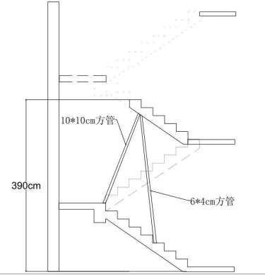 在8月12日事发当天的拆除作业中,除了用一条截面规格为10*10cm的长方钢管斜顶在梯段底部做支撑外,时超群还临时增加了一条截面规格为6*4cm的长方钢管支撑在梯段下方。(事发时的防护支撑如图3所示)
