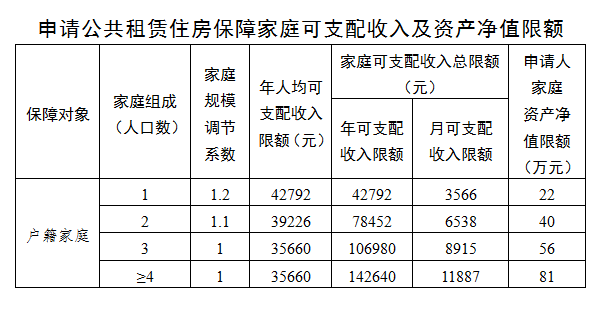 一、调整收入线准入标准:将现行收入线准入标准限额从家庭年人均可支配收入29434元/年调整为35660元/年(约为2017年城市常住居民人均可支配收入的65%),涨幅21%,并按照收入线调整幅度同步调整资产限额。