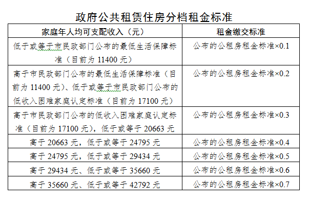 三、调整实物配租计租标准:下调租金缴交比例,从目前按公租房项目租金标准的20%-70%缴交调整为按10%-60%缴交,扩面后的新增人群按照70%缴交。按此调整后,租金下调幅度为14.29%—50%,收入越低,下调幅度越大,同时采取租金封顶制度,租金按该家庭经核定的月可支配收入的15%封顶,超出15%的租金予以免交。