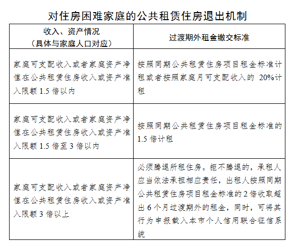 四、完善退出机制:给予所有经审核不再符合公共租赁住房保障资格的家庭6个月的过渡期,过渡期满后,按收入、资产、住房情况分类处置:家庭可支配收入或资产在公租房准入限额标准1.5倍以内的,可以选择按照公租房项目租金计租,或者按照家庭月可支配收入的20%计租;在1.5倍至3倍之间的,按照公租房项目租金的1.5倍计租;超出3倍的,必须腾退现住房。