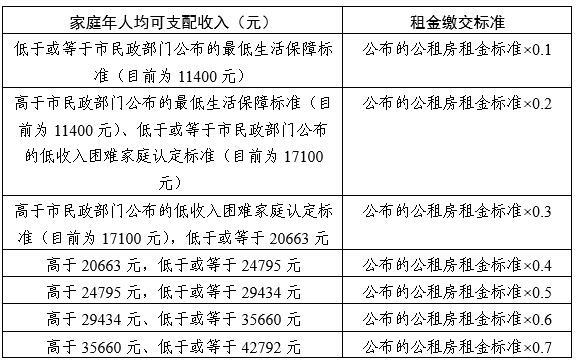 (三)调整实物配租计租方式:1.整体下调租金缴交比例,从目前按公租房项目租金标准的20%-70%缴交调整为按10%-60%缴交,扩面后的新增人群按照70%缴交。按此调整后,租金整体下调幅度为14.29%—50%,收入越低,下调幅度越大。2.对房租占家庭月可支配收入比例超出15%的家庭,实行15%封顶制度,租金按该家庭经核定的月可支配收入的15%封顶。