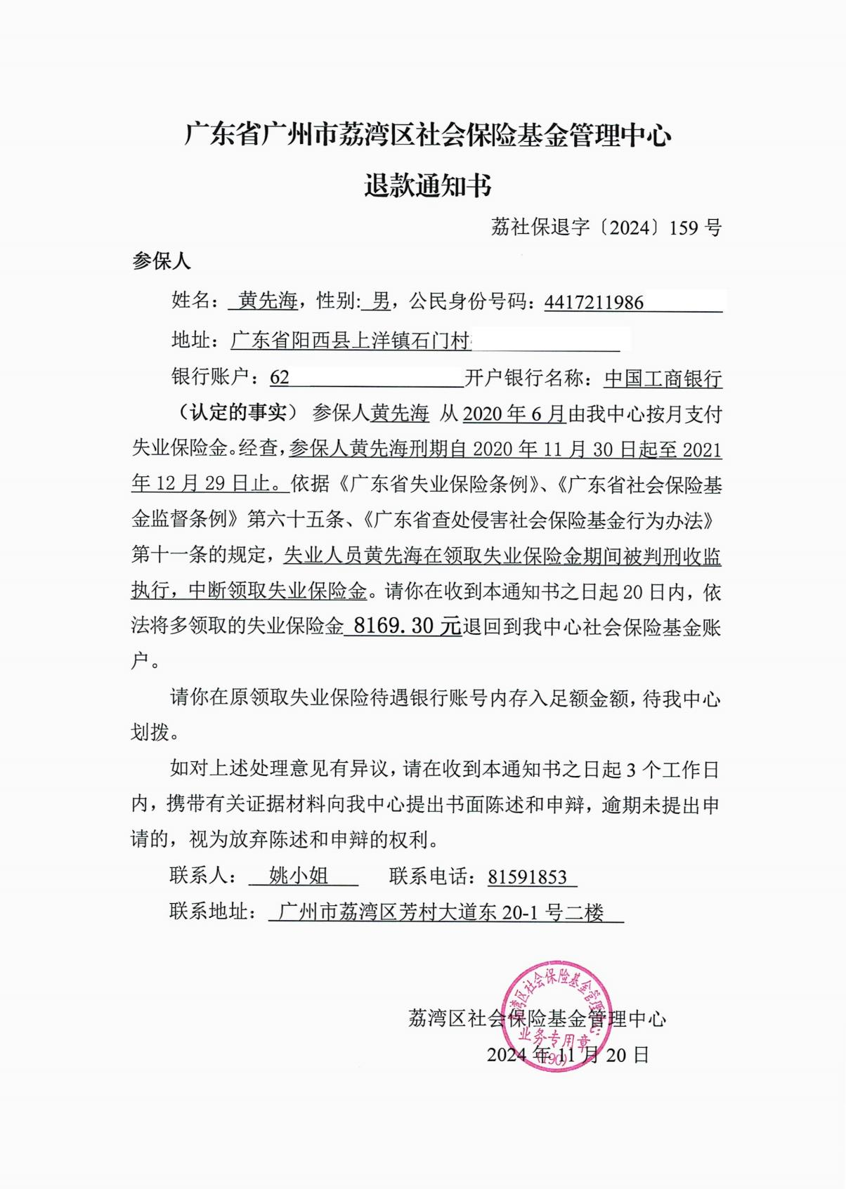 经查,你(4417211986********)在领取失业待遇期间被判监执行,不符合《广东省失业保险条例》第二十八条规定,失业人员在领取失业保险金期间被判刑收监执行或者被强制隔离戒毒的中断领取失业保险金,多领取的失业保险待遇应当退回社会保险基金。我中心向你发出《退款通知书》(荔社保退字〔2024〕159号),要求你提供你本人广州市内工行、农行、建行、中行、邮储等银行账号,存入足额金额,待我中心划拨。由于无法与你取得联系,现公告送达《退款通知书》(荔社保退字〔2024〕159号)。本公告自发布之日起经过30日,视为送达。