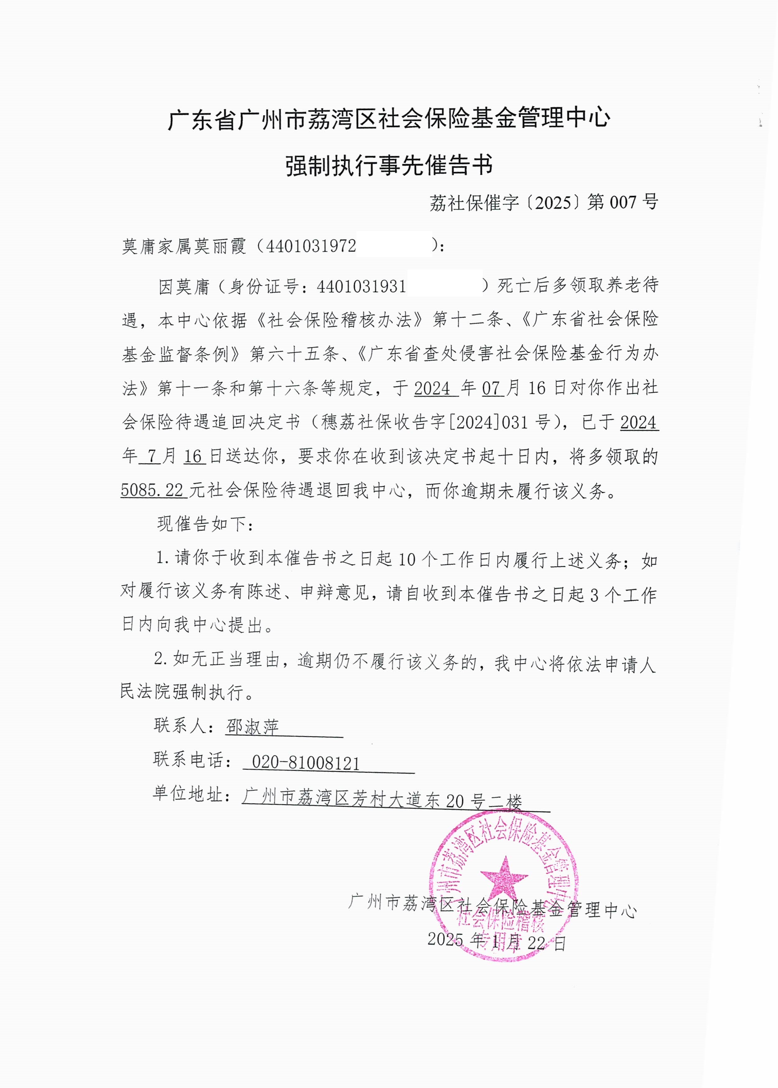 经查,莫庸(4401031931********)在死亡后多领取养老待遇,本中心依据《社会保险稽核办法》第十二条、《广东省社会保险基金监督条例》第二十条及第六十五条、《广东省查处侵害社会保险基金行为办法》第十一条和第十六条等规定,于2024年07月16日对你作出社会保险待遇追回决定书(穗荔社保收告字〔2024〕031号),已于2024年7月16日送达你,要求你在收到该决定书起十日内,将多领取的5085.22元社会保险待遇退回我中心。因你逾期未履行该义务,现我中心向你发出《强制执行事先催告书》(荔社保催字〔2025〕第007号)。由于无法与你取得联系,现公告送达《强制执行事先催告书》(荔社保催字〔2025〕第007号)。本公告自发布之日起经过30日,视为送达。