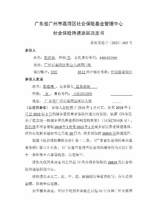 经查,彭桂林(身份证号:4401031945********)于2018年1月死亡,但其2018年2月至2022年2月的城乡居民养老保险待遇仍有发放。依据《国务院关于建立统一的城乡居民养老保险制度的意见》(国发[2014]8号),彭桂林不符合领取2018年2月至2022年2月城乡居民养老待遇条件。我中心向你发出《退款通知书》(荔社保退字〔2024〕141号),要求你提供在原领取养老待遇定期待遇银行账号内存入足额金额,待我中心划拨,而你逾期未履行该义务。现我中心向你发出《社会保险待遇追回决定书》(荔社保追字〔2025〕003号)。由于无法与你取得联系,现公告送达《社会保险待遇追回决定书》(荔社保追字〔2025〕003号)。本公告自发布之日起经过30日,视为送达。