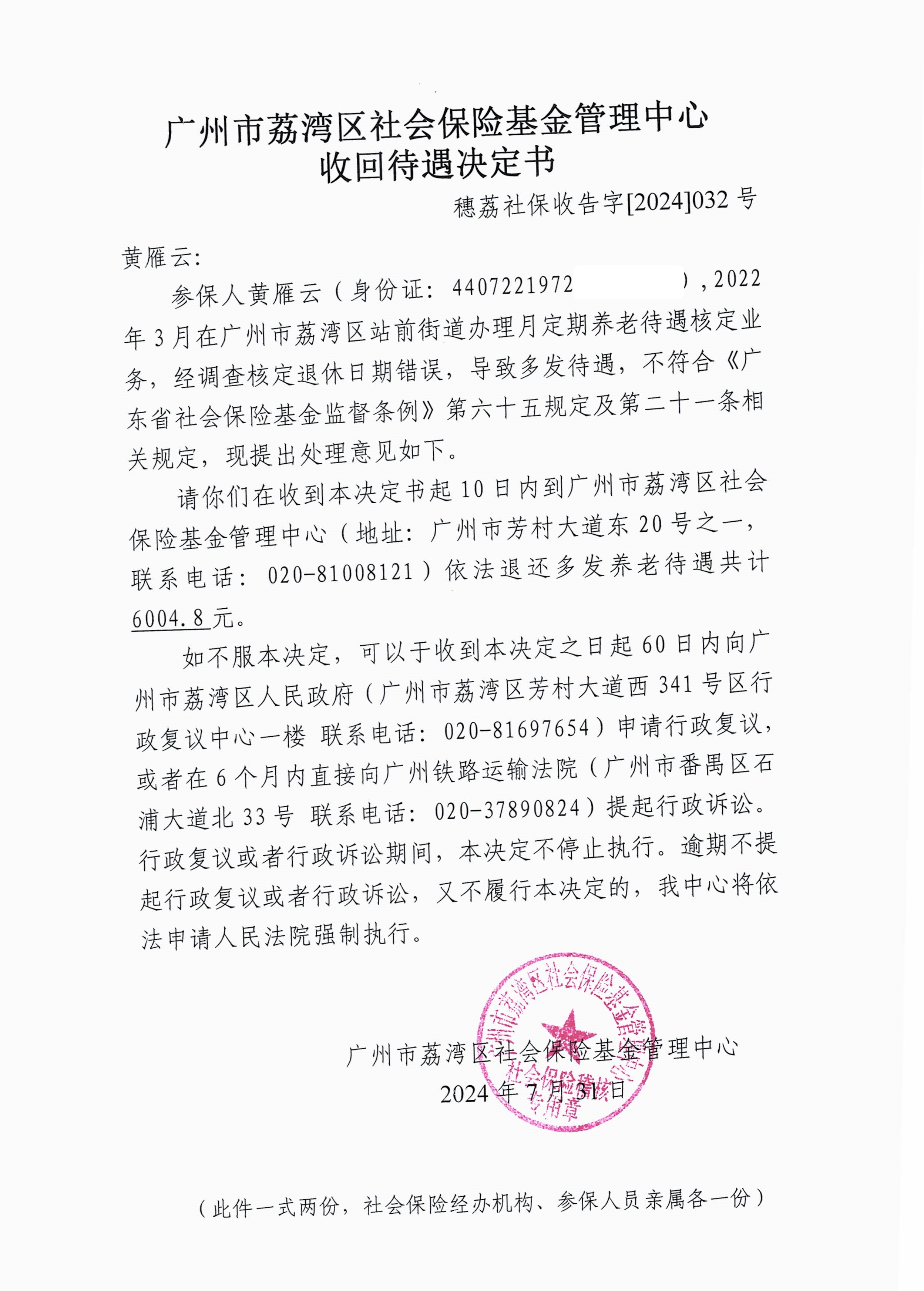 经查,你(4407221972********)2022年3月在威尼斯人app站前街道办理月定期养老待遇核定业务,经调查核定退休日期错误,导致多发待遇,不符合《广东省社会保险基金监督条例》第六十五规定及第二十一条相关规定,多领取的养老保险待遇应当退回社会保险基金。我中心向你发出《退款通知书》(荔社保退字〔2024〕053号),要求你提供你本人广州市内工行、农行、建行、中行、邮储等银行账号,存入足额金额,待我中心划拨,而你逾期未履行该义务。现我中心向你发出《社会保险待遇收回决定书》(穗荔社保收告字〔2024〕032号)。由于无法与你取得联系,现公告送达《社会保险待遇收回决定书》(穗荔社保收告字〔2024〕032号)。本公告自发布之日起经过30日,视为送达。