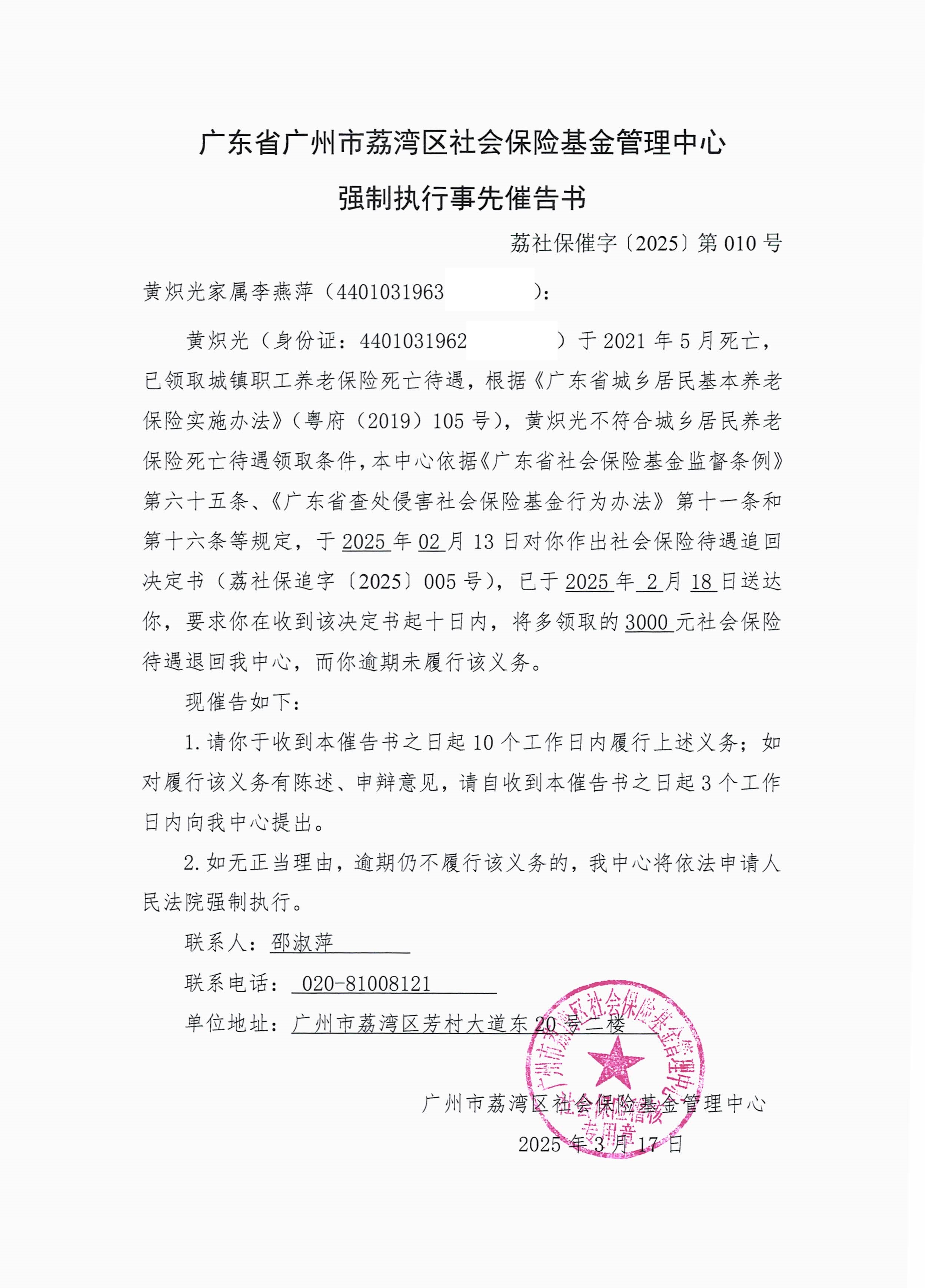 经查,黄炽光(4401031962********)在死亡后已领取城镇职工养老保险死亡待遇,根据《广东省城乡居民基本养老保险实施办法》(粤府(2019)105号),黄炽光不符合城乡居民养老保险死亡待遇领取条件。本中心依据《社会保险稽核办法》第十二条、《广东省社会保险基金监督条例》第二十条及第六十五条、《广东省查处侵害社会保险基金行为办法》第十一条和第十六条等规定,于2025年02月13日对你作出社会保险待遇追回决定书(荔社保追字〔2025〕005号),已于2025年2月18日送达你,要求你在收到该决定书起十日内,将多领取的3000元社会保险待遇退回我中心。因你逾期未履行该义务,现我中心向你发出《强制执行事先催告书》(荔社保催字〔2025〕第010号)。由于无法与你取得联系,现公告送达《强制执行事先催告书》(荔社保催字〔2025〕第010号)。本公告自发布之日起经过30日,视为送达。