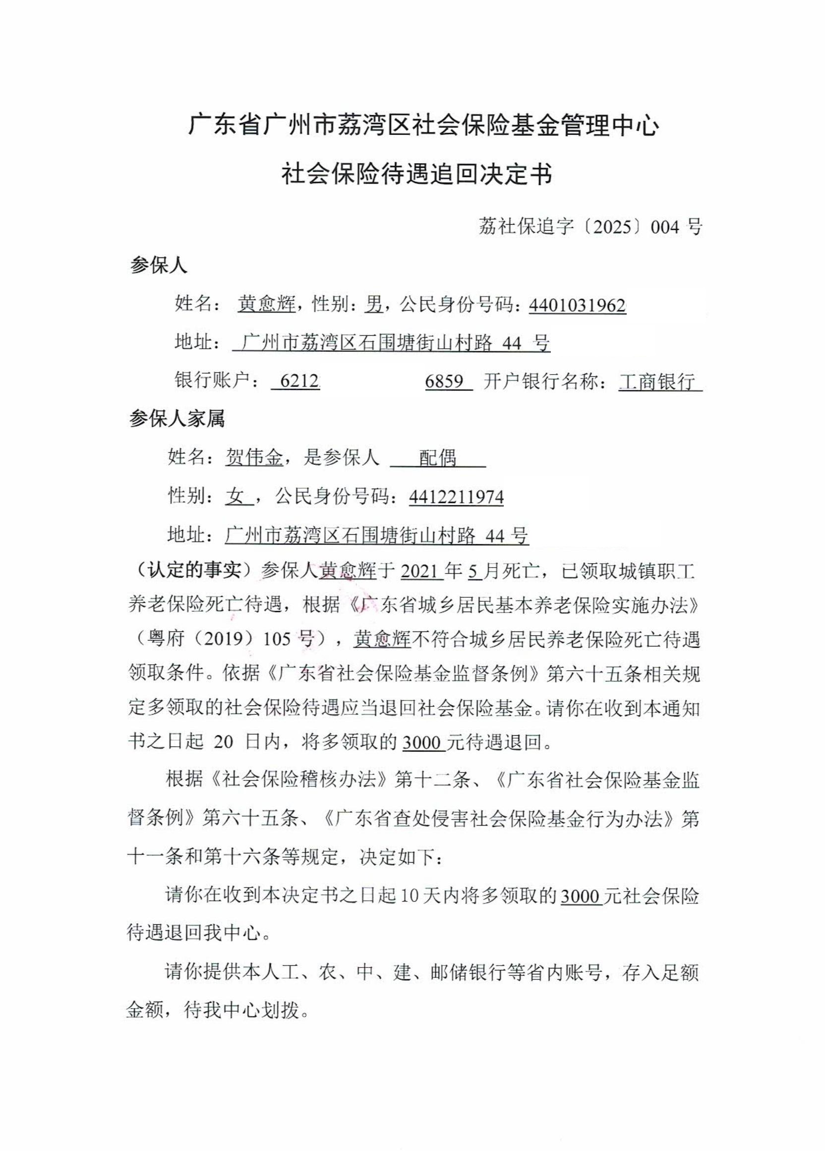 经查,黄愈辉(身份证号:4412211974********)于2021年5月死亡,已领取城镇职工养老保险死亡待遇,根据《广东省城乡居民基本养老保险实施办法》(粤府(2019)105号),黄愈辉不符合城乡居民养老保险死亡待遇。我中心向你发出《退款通知书》(荔社保退字〔2024〕104号),要求你提供在原领取养老待遇定期待遇银行账号内存入足额金额,待我中心划拨,而你逾期未履行该义务。现我中心向你发出《社会保险待遇追回决定书》(荔社保追字〔2025〕004号)。由于无法与你取得联系,现公告送达《社会保险待遇追回决定书》(荔社保追字〔2025〕004号)。本公告自发布之日起经过30日,视为送达。