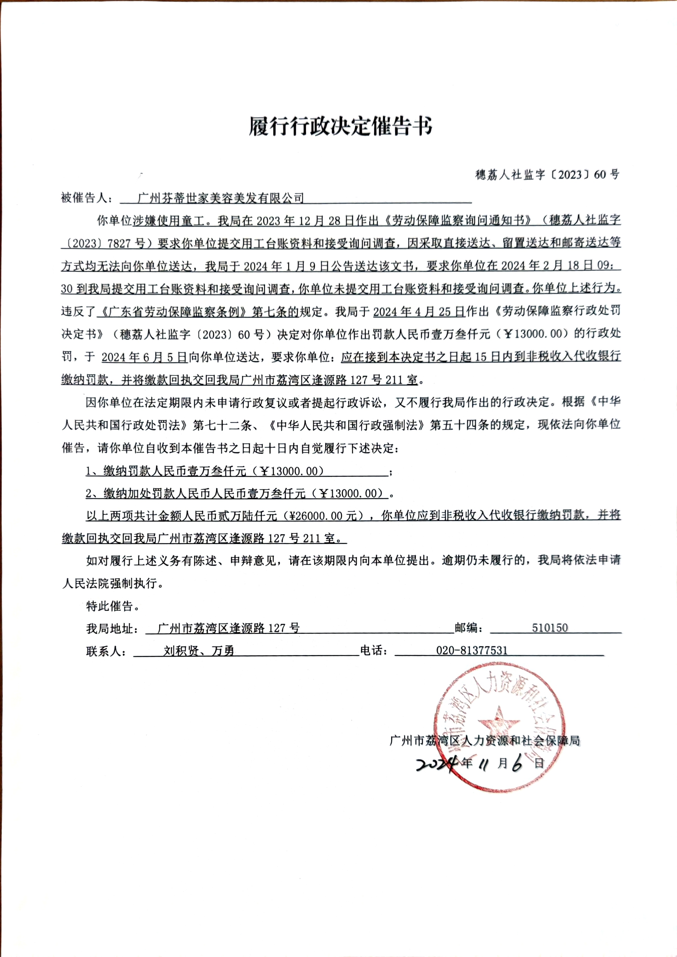 我局查处你单位涉嫌使用童工,你单位不配合调查和提交用工台账一案,在2024年11月6日作出《履行行政决定催告书》(穗荔人社监字〔2023〕60号),因无法与你单位取得联系,我局采取直接送达、留置送达和邮寄送达等方式均无法向你单位送达,现依照《广东省劳动保障监察条例》第四十七条规定向你单位公告送达。自发出本公告之日起,经过30日即视为送达。