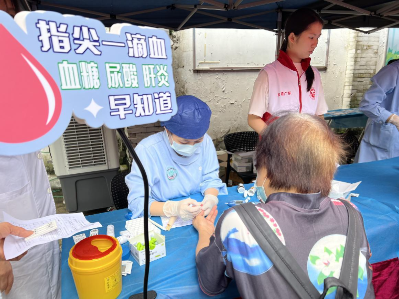 活动现场科学规划设置登记区、检测区、咨询区、展示区等功能分区,各环节衔接有序、运转高效。在检测区,血压检测点医护人员严谨记录数据,结合居民既往病史给予个性化健康指导;指尖血检测项目覆盖乙肝、丙肝、HIV、梅毒筛查及血糖、尿酸检测,系统筛查居民健康状况;现场同时提供骨密度检测服务,专业技术人员根据检测报告做权威解读;针对老年群体的脑健康认知筛查环节,通过专业量表评估与互动问答相结合的方式,全面了解老年居民认知功能状况,为早期识别认知障碍风险提供科学依据;中医耳穴艾灸服务区,中医师根据居民体质与需求精准贴压耳穴、温和艾灸,舒缓居民疲劳、调理身心。活动累计为100余名居民完成检测,对指标异常者及时指引至专家处咨询。