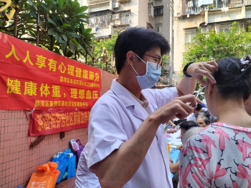 活动当天,医务人员还为居民提供义诊咨询活动,为有需要的居民进行心理评估和心理疏导,并指引后续的专业医疗服务。针对现场居民存在失眠、焦虑的症状,社区的中医师还运用中医传统疗法,对该类人群进行耳穴压豆理疗,同时通过心理暗示及情志疗法以达到缓解焦虑的作用。
