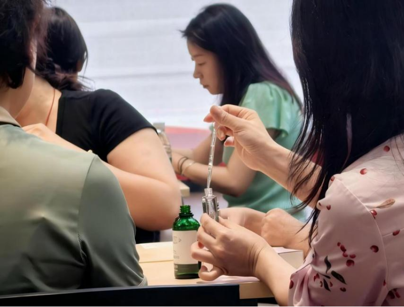 活动伊始,专业导师详细讲解了五种精油的香气特点:桂花温润清甜、玫瑰馥郁浓烈、茉莉清新雅致、檀香沉稳醇厚、薰衣草宁静舒缓。导师还介绍了精油配比对香气整体呈现的影响,帮助职工掌握调香技巧。