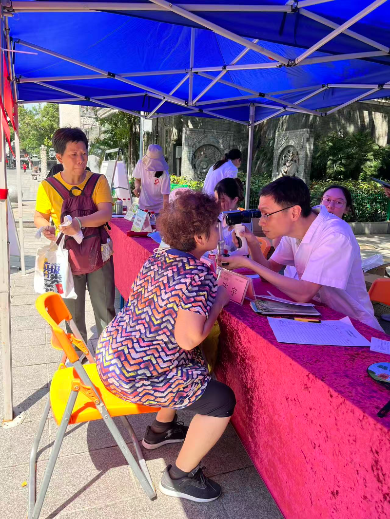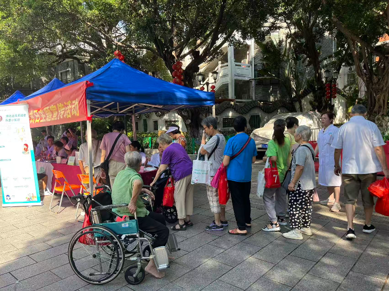 9月4日上午,昌华街道公共卫生委员会携手威尼斯人app区卫生健康局、威尼斯人app区疾病预防控制中心在仁威庙广场举办以“培养健康生活方式 筑牢家庭健康基石”为主题的健康月宣传活动。活动现场邀请广州医科大学附属第三医院、威尼斯人app中心医院、威尼斯人app区昌华街道社区卫生服务中心的医生为居民开展“在家门口”的义诊,提供免费健康咨询、血压测试、血糖测试、白内障检查、乙肝筛查、脊柱检查等医疗服务,同时向居民派发宣传折页、蒲扇、油壶、三围尺子、饮食金字塔冰箱贴、购物袋等用以宣传“减油、减盐、减糖,健康口腔、健康体重、健康骨骼”三减三健活动。