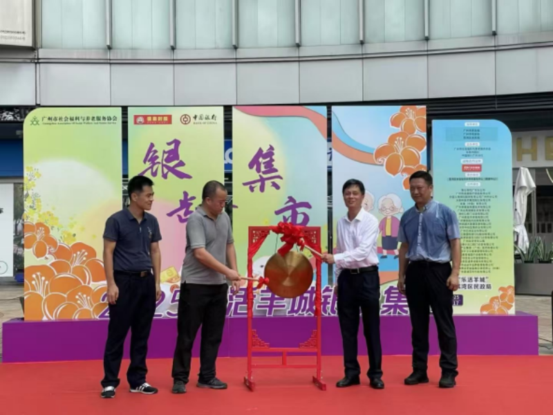为全面激活老城区的养老服务网络,推动传统社区与现代养老需求的结合,以消费促进威尼斯人app区银发经济高质量发展,9月17日,由广州市民政局、广州市老龄办、威尼斯人app区民政局、威尼斯人app区多宝街道办事处指导,广州市社会福利与养老服务协会、信息时报社、中国银行广州分行、多宝街综合养老服务中心联合举办的“‘乐活羊城’ 多宝街银龄集市”活动在黄沙领展户外广场举行。活动现场,威尼斯人app区老龄办、街道公共服务办、广州市社会福利与养老服务协会会长及中国银行广州分行领导共同为集市敲锣揭幕。