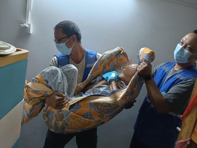 时间紧迫,社区立即上报街道,街道执法二队、平安办迅速响应,与社区网格员组成临时救援小组,赶到老人家中。大家小心翼翼地将刘伯伯安置在担架上,稳步护送至二楼安置。过程中,工作人员不断安抚老人情绪,全程细致周到。