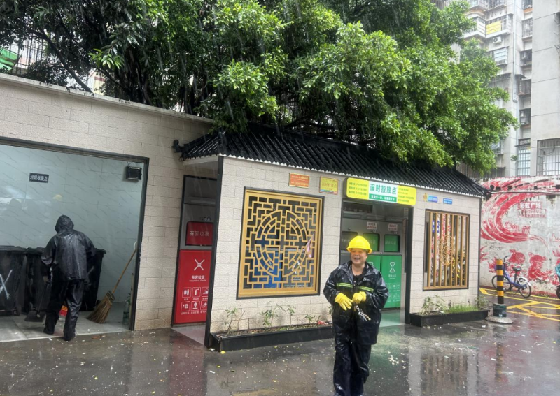 在园中园社区等投放点,环卫工人认真清理落地垃圾,反复冲刷垃圾桶内外,随后喷洒消毒剂除味。此次行动不仅清理路面垃圾,更针对台风后细菌滋生隐患,对辖区61个垃圾投放点实施“三清三消杀”:清污垢、清积水、清破损,消杀桶体、消杀地面、消杀排水口,同步维修移位、松动垃圾桶6个。“以前雨后垃圾桶总飘异味,这次冲洗得比家里还干净!”居民点赞道。
