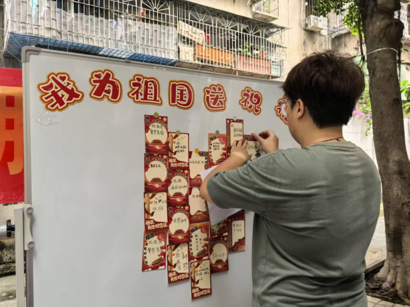 (图:居民在祝福墙上写上对祖国祝福的话语)