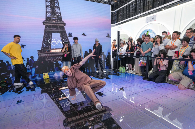 2024年9月14日,在2024年服贸会国家会议中心综合展区的主宾国法国展台,中法两国街舞好手在表演霹雳舞。